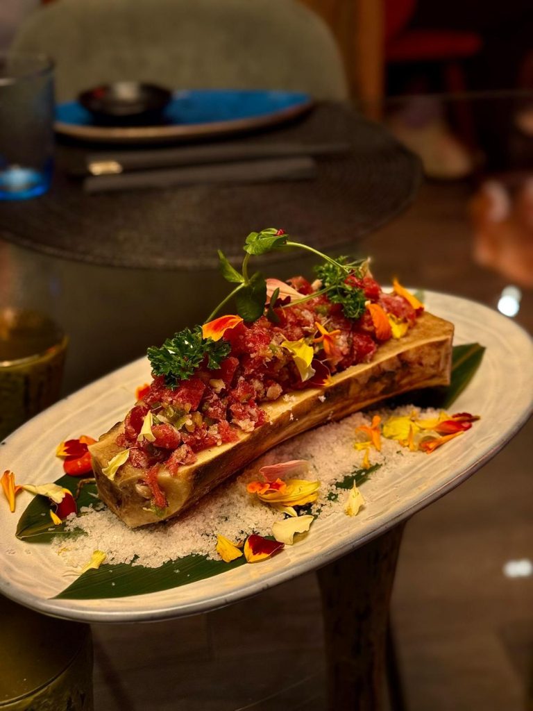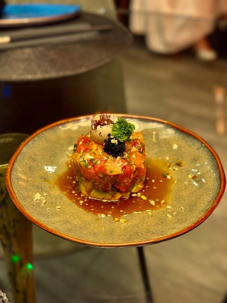Tártaro Oshiki — yellowtail com sunomono de maçã verde, caviar, molho a base de leche de tigre, azeite de ervas e ovo de codorniz;