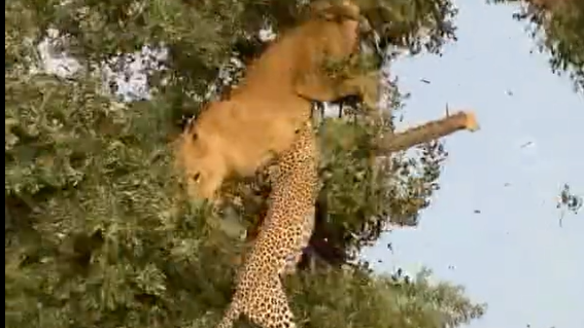 Segundo a legenda da publicação, “um leopardo tinha-se esforçado para caçar a sua presa e puxou-a para cima da árvore, em busca de segurança. Mas chega uma leoa, determinada a roubar-lhe a refeição”. O confronto intensifica-se quando ambos os animais disputam a presa no mesmo ramo.