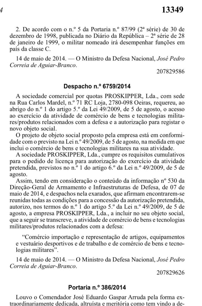 A PROSKIPPER, Lda., a empresa que fez os ajustes diretos com a Marinha que estiveram sob a mira do Tribunal de Contas foi autorizada a exercer atividade “de comércio de bens e tecnologias militares/produtos relacionados com a defesa” em 2014, pelo então Ministro da Defesa, José Pedro Aguiar-Branco.