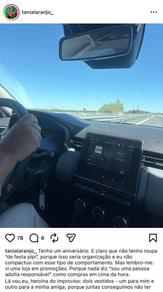 Pouco depois, a própria Tânia Laranjo acabou por apagar a publicação original, voltando a partilhá-la minutos depois com a imagem editada, já sem o detalhe do velocímetro visível.