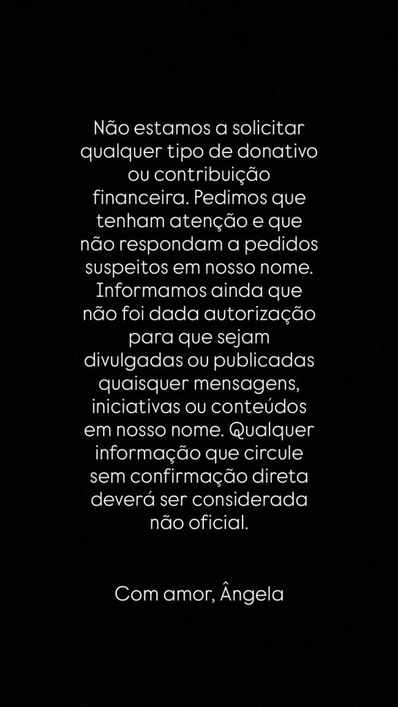 Nas suas stories do Instagram, Ângela explicou: “Não estamos a solicitar qualquer tipo de donativo ou contribuição financeira. Pedimos que tenham atenção e que não respondam a pedidos feitos em nosso nome. Informamos ainda que não foi dada autorização para que sejam divulgadas ou publicadas quaisquer mensagens, iniciativas ou conteúdos em nosso nome. Qualquer informação que circule sem confirmação direta deverá ser considerada não oficial.”