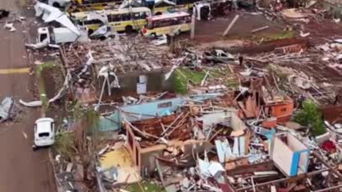 Um vídeo divulgado nas redes sociais mostra imagens de drone. O cenário de destruição é total, com edifícios arrasados, árvores caídas e carros destruídos.