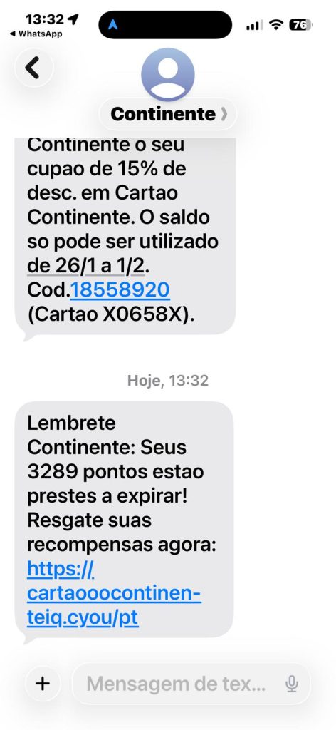 Na mensagem a que o 24Horas teve acesso e que foi recebida este domingo por clienteS com Cartão Continente pode ler-se: “Lembrete Continente: Seus 3289 pontos estão prestes a expirar”. O objetivo é levar os destinatários a clicar no link, que redireciona para páginas falsas criadas para recolher dados pessoais e, em alguns casos, informações bancárias. Os clientes recebem as mensagens no seu telemóvel através do número habitual de envio de informação usado pelos supermercados Continente.