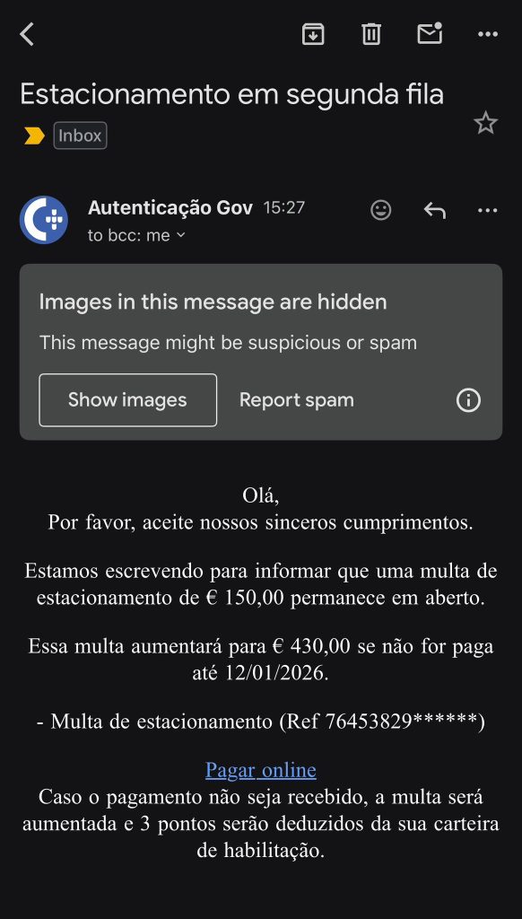 “Estamos escrevendo para informar que uma multa de estacionamento de 150 euros permanece em aberto. Essa multa aumentará para 430 euros se não for paga até 12/01/2026”, pode ler-se no e-mail, em português do Brasil, recebido já por muitos portugueses.