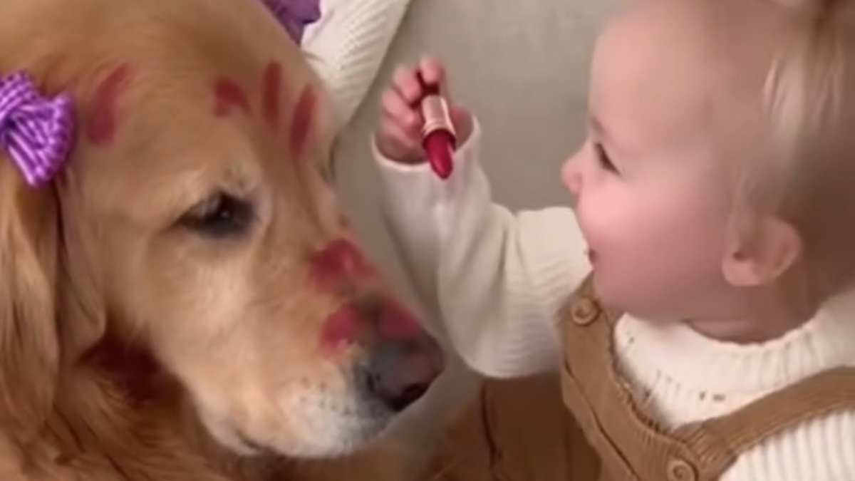 Divertida, a pequena artista segura o batom e aplica no focinho do golden retriever, que permanece sereno do início ao fim, enquanto é pintado.