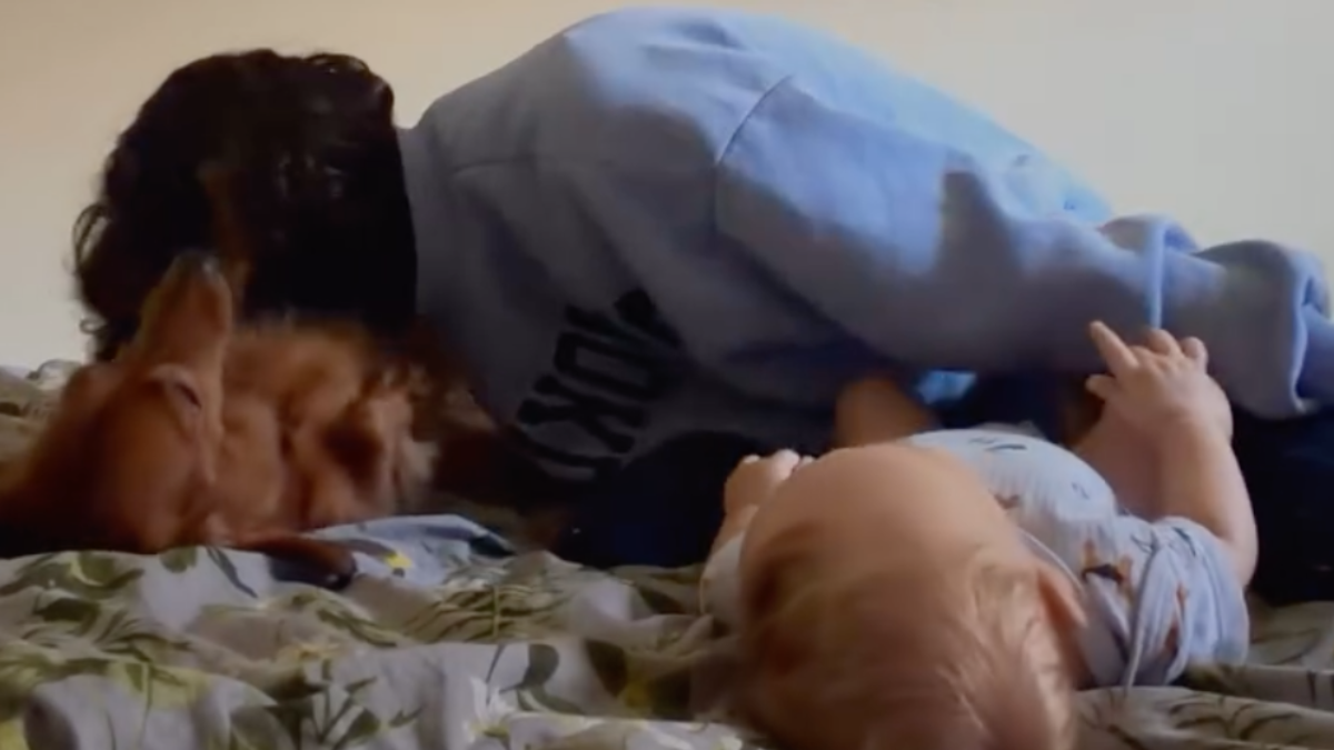 O vídeo mostra um momento de ternura: uma mãe a encher o seu bebé de beijos, enquanto o cão da família se aproxima, cheio de entusiasmo, abanando a cauda de felicidade, a ‘pedir’ beijos na barriga. A cena transmite harmonia e carinho entre humanos e animais.