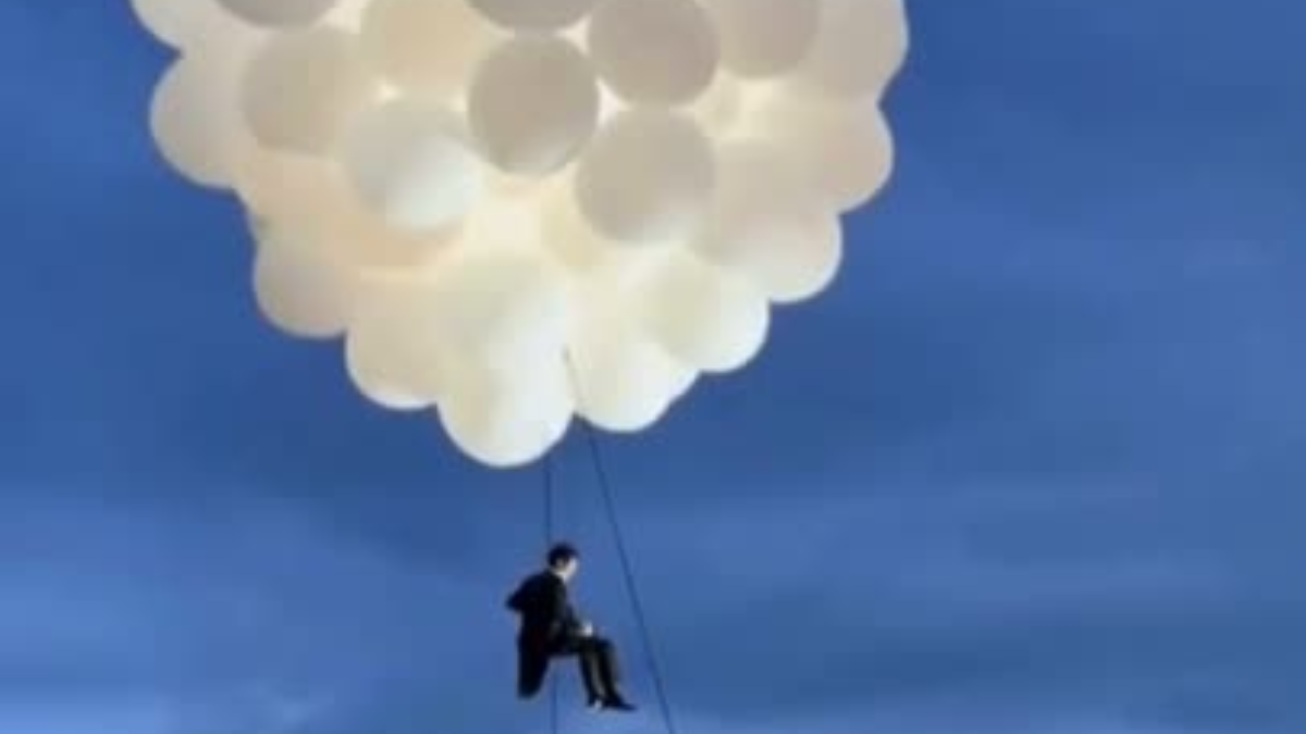 Parece uma cena de filme, mas aconteceu mesmo. Um homem surpreendeu tudo e todos ao chegar à boda a ‘voar’, pendurado em dezenas de balões brancos.