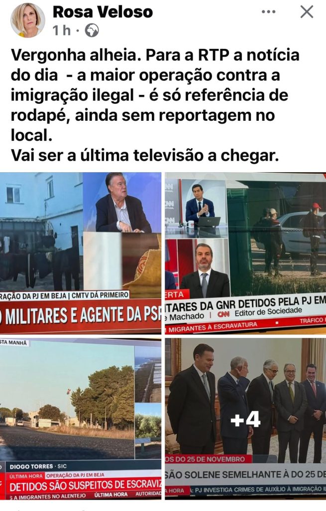 No Facebook, Rosa Veloso deixou o seu descontamento bem visível. “Vergonha alheia. Para a RTP a notícia do dia – a maior operação contra a imigração ilegal – é só referência de rodapé, ainda sem reportagem no local. Vai ser a última televisão a chegar”, escreveu, partilhando fotos das outras televisões já presentes no local, como a CMTV, CNN Portugal e SIC Notícias.