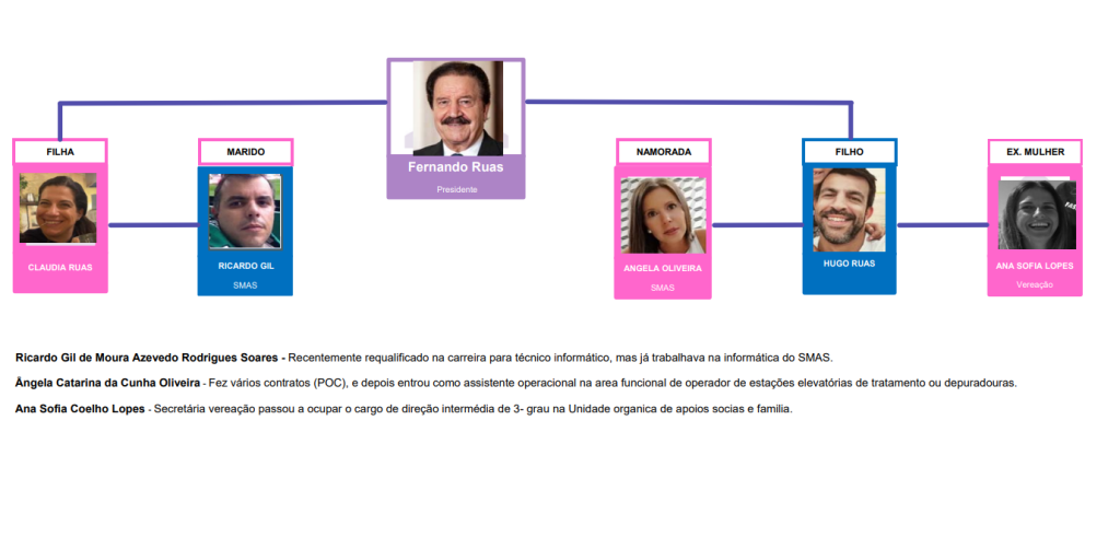 O seu genro, Ricardo Gil, passou, por despacho da Águas de Viseu, de Assistente Técnico a Técnico de Informática Grau 1. Já a namorada do filho, Ângela Oliveira, iniciou-se com contratos (POC) e depois entrou como assistente operacional na função de operadora de estações elevatórias de tratamento/depuradoras nos Serviços Municipalizados de água e Saneamento de Viseu (SMAS). Também a ex-mulher do filho de Fernando Ruas beneficiou de uma ascensão: foi secretária da vereação e passou a ocupar um cargo de direção intermédia de 3.º grau na Unidade Orgânica de Apoios Sociais e Família.