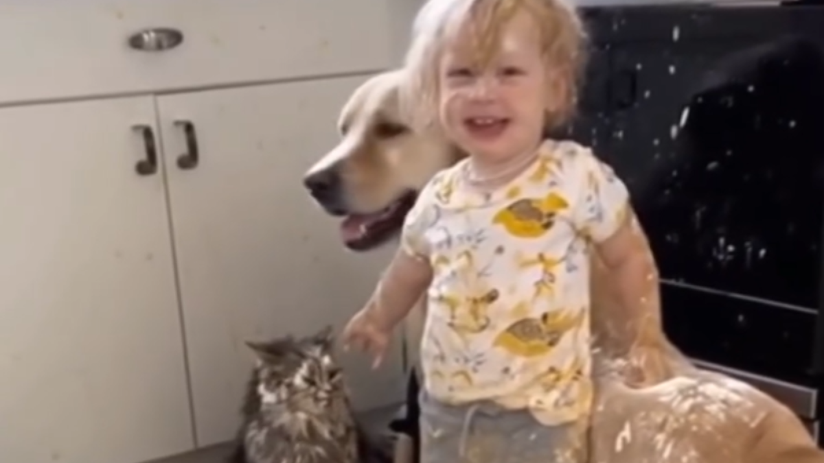 O caos instalou-se nesta cozinha: uma criança, dois gatos e um cão, todos cobertos de farinha e ovos. Mas, afinal, quem será o culpado?