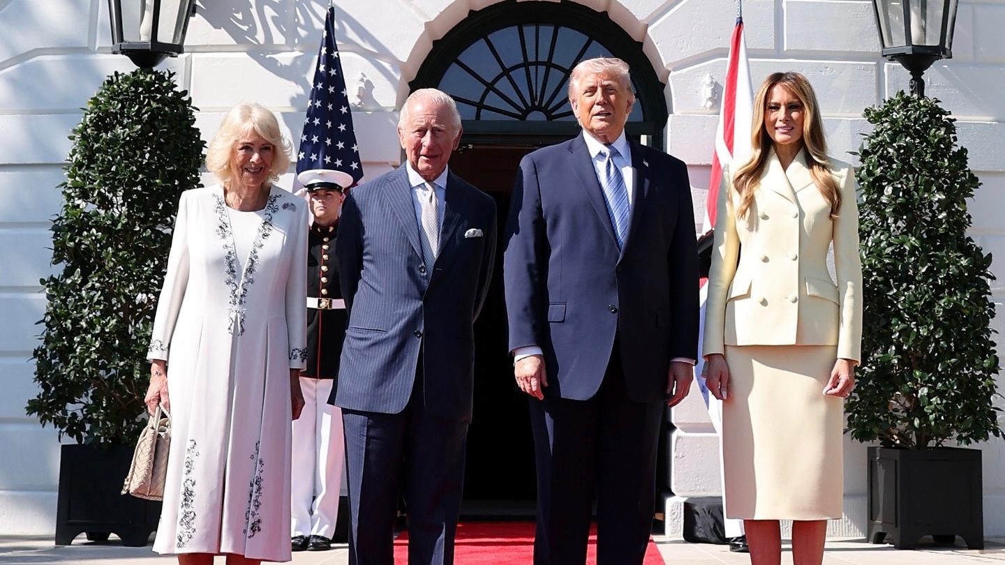 Logo após a chegada, Carlos III e Camila dirigiram-se à Casa Branca, onde foram recebidos por Donald Trump e pela primeira-dama, Melania. O encontro começou com a tradicional sessão fotográfica no jardim sul, seguindo-se um momento mais informal no interior, onde os quatro partilharam um chá.