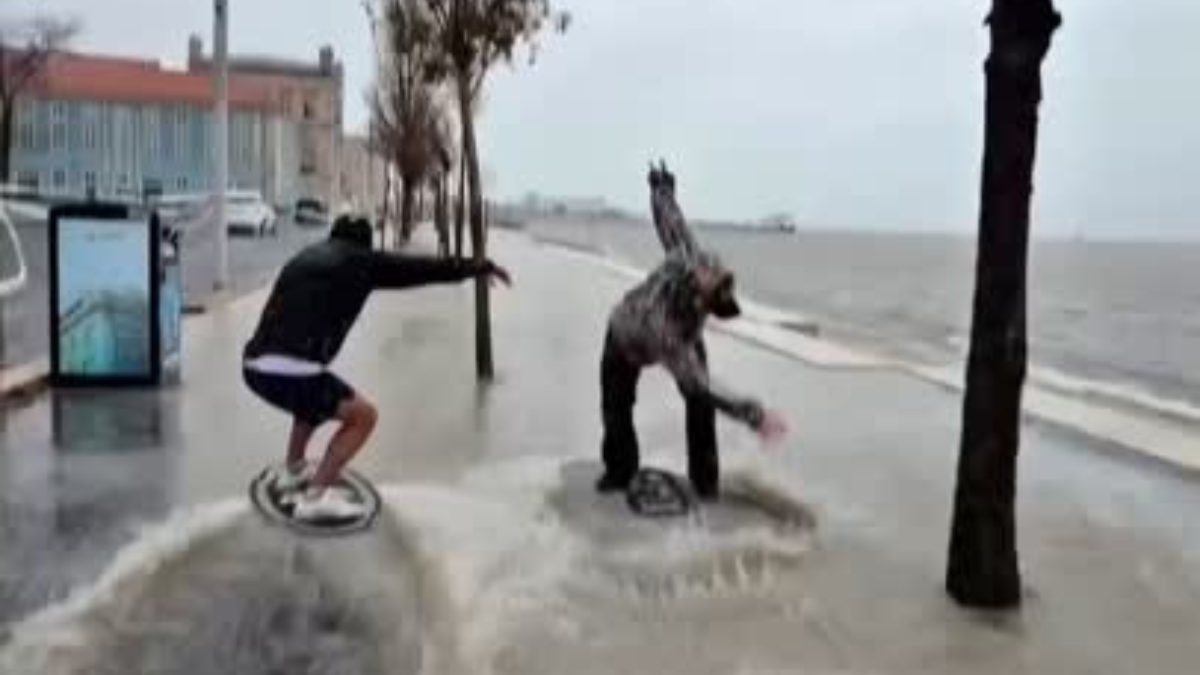 O mau tempo tem provocado grandes constrangimentos em Portugal, mas há quem se consiga divertir com a água que se acumula devido à chuva. É o caso de Lucas Fink e Adrien Raza, dois dos nomes muito conhecidos do skimboard, que mostraram que a modalidade não tem de ser só praticada no mar.