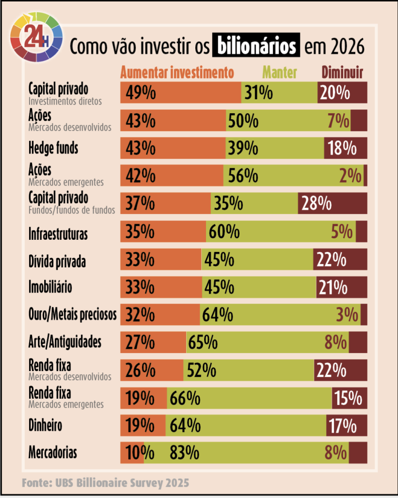 Já outros setores mais tradicionais como imóveis, dívida pública, ouro e ativos alternativos como arte não atraem tanto interesse em termos de novos investimentos, com a maioria dos bilionários a preferir manter, ou apenas ligeiramente ajustar, as posições já existentes.