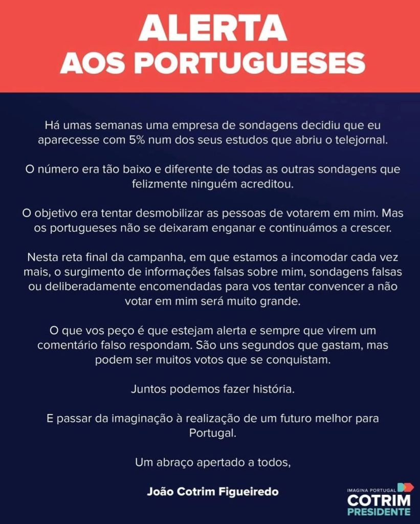 Desde o fim de semana que se antecipava que este rumor poderia ganhar forma de acusação sobretudo desde que o próprio candidato emitiu nas suas redes sociais um “alerta aos portugueses” no qual, a certa altura, dizia que “nesta reta final da campanha, em que estamos a incomodar cada vez mais, o surgimento de informações falsas sobre mim (…) será muito grande”.