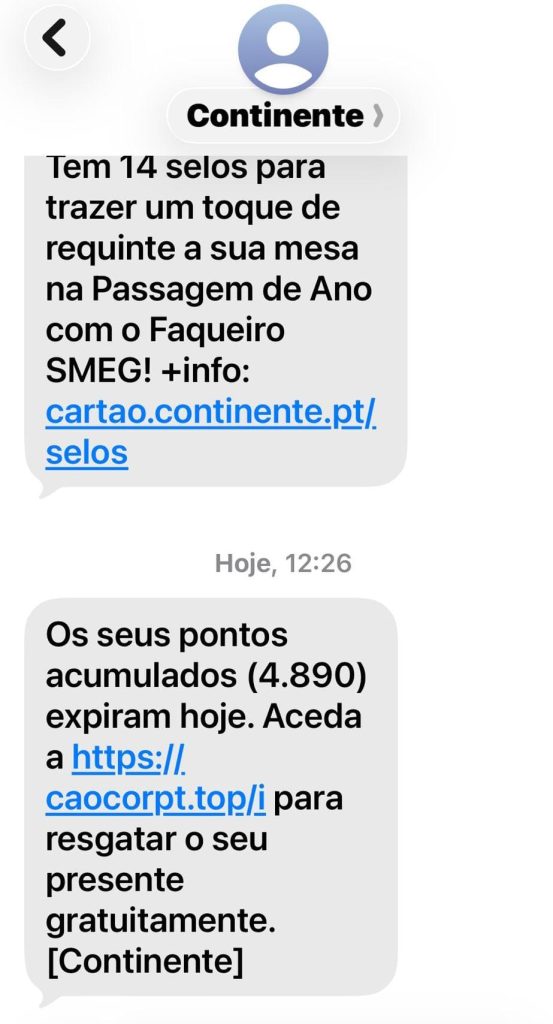 As mensagens surgem identificadas como sendo do Continente e incluem textos como: “Os seus pontos acumulados expiram hoje”. O objetivo é levar os destinatários a clicar no link, que redireciona para páginas falsas criadas para recolher dados pessoais e, em alguns casos, informações bancárias.