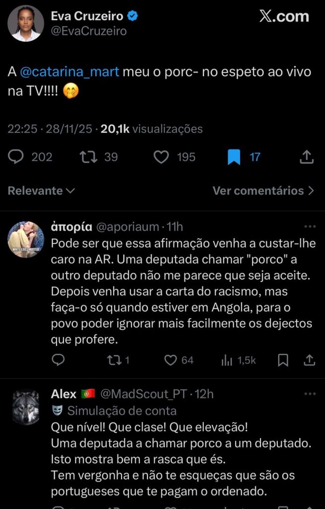 Pouco depois do debate, na TVI, a deputada do Partido Socialista Eva Cruzeiro (37) publicou no X (antigo Twitter) uma frase com grande impacto: “A Catarina Martins (co)meu o porco no espeto ao vivo na TV.” A provocação dirigida a André Ventura suscitou muitas reações: houve quem aplaudisse o comentário, houve quem o considerasse desmedido ou inadequado.