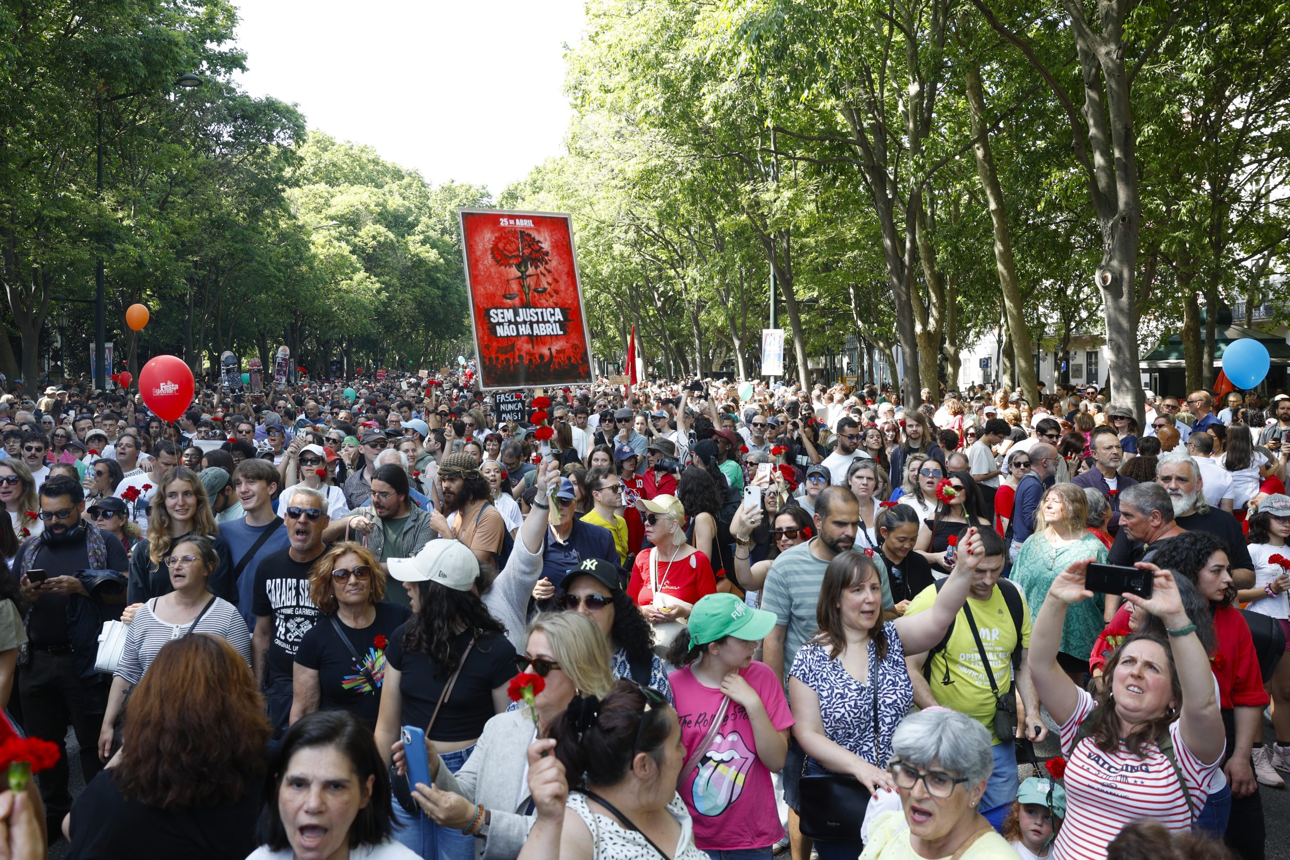 A Avenida da Liberdade, em Lisboa, voltou a encher-se este sábado, dia 25, para assinalar mais um aniversário da Revolução dos Cravos, com milhares de pessoas a participarem na tradicional marcha comemorativa. Entre cravos vermelhos e palavras de ordem, marcaram presença várias gerações, num ambiente onde se cruzaram memórias históricas e reivindicações atuais.