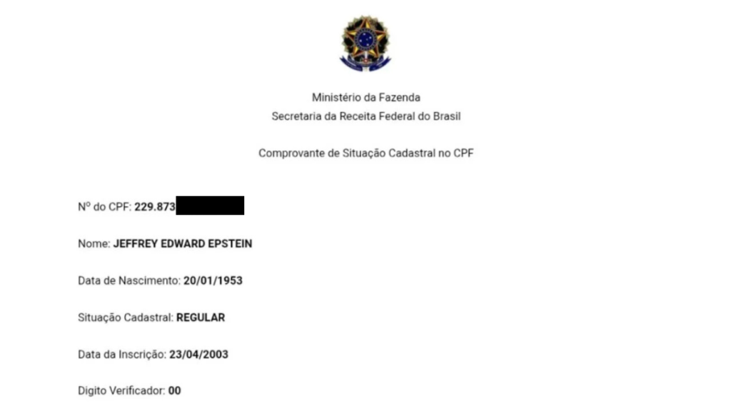 De acordo com os registos divulgados, o número de Cadastro de Pessoa Física foi emitido a 23 de abril de 2003 e apresentava a situação “regular” junto da Receita Federal do Brasil. O documento está associado ao nome completo de Epstein e à sua data oficial de nascimento, 20 de janeiro de 1953.