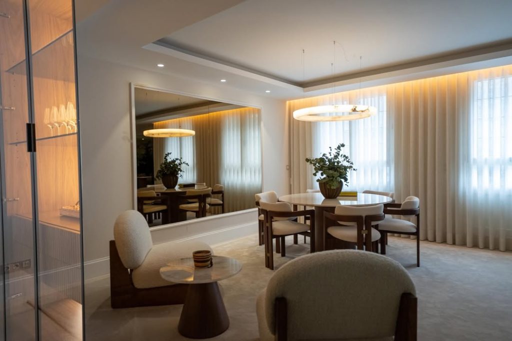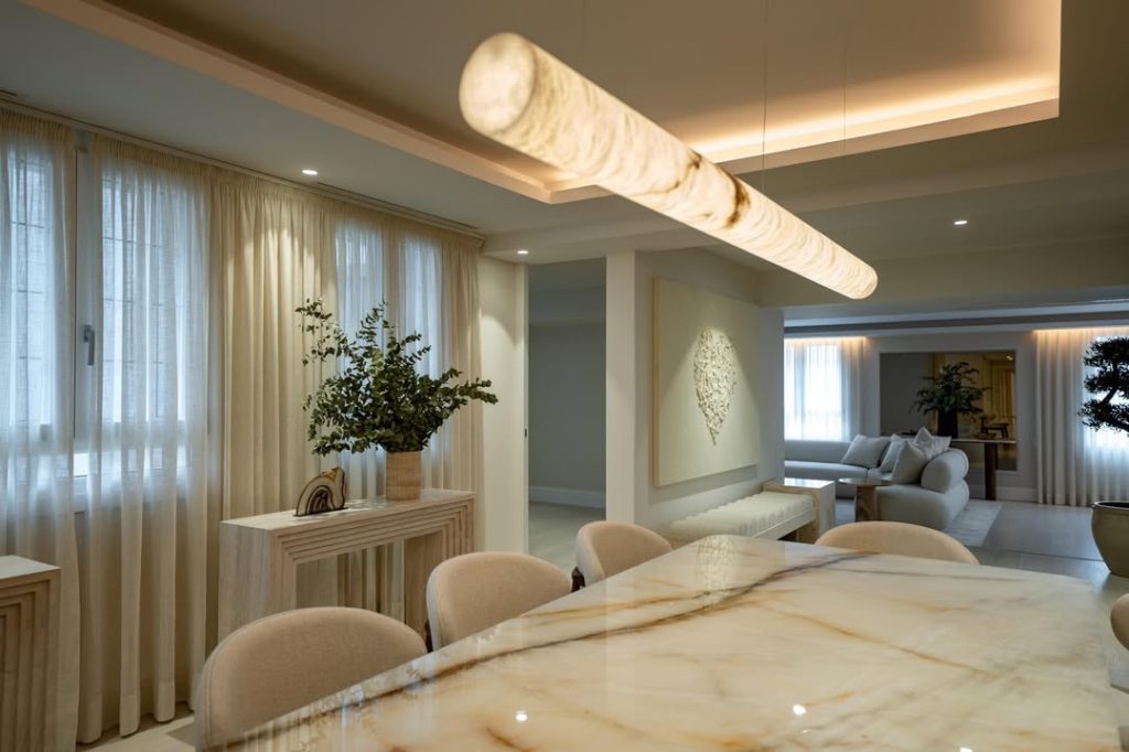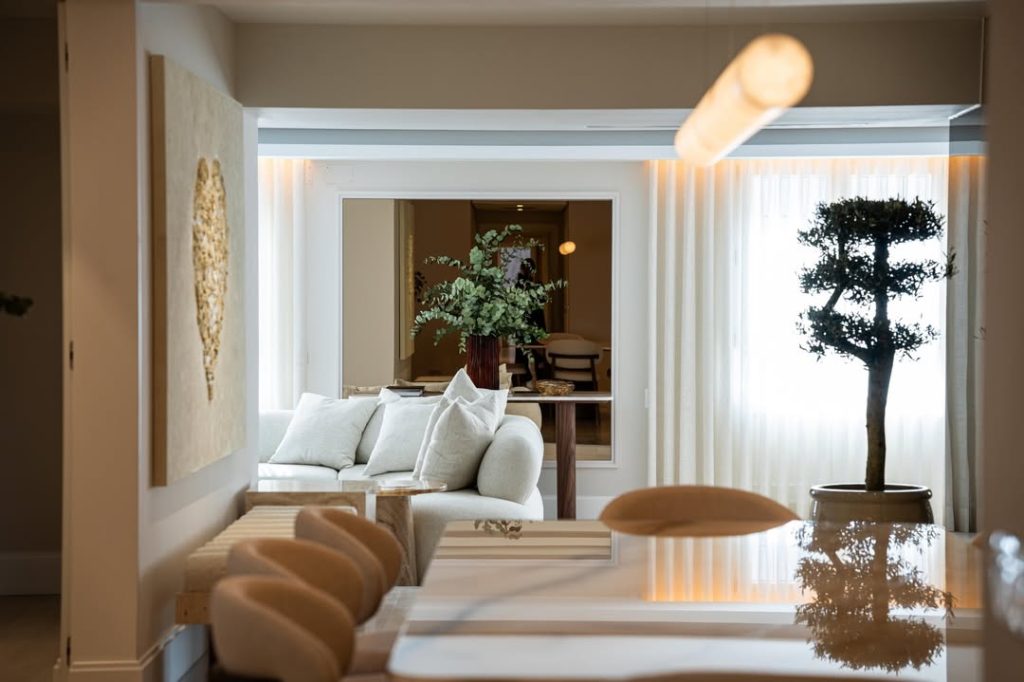 A propriedade situa-se na Rua Serrano, no bairro de Salamanca, uma das zonas mais exclusivas da capital espanhola. O imóvel foi decorado em tons neutros, entre o branco e o bege, e integra elementos que refletem um estilo contemporâneo e sofisticado.