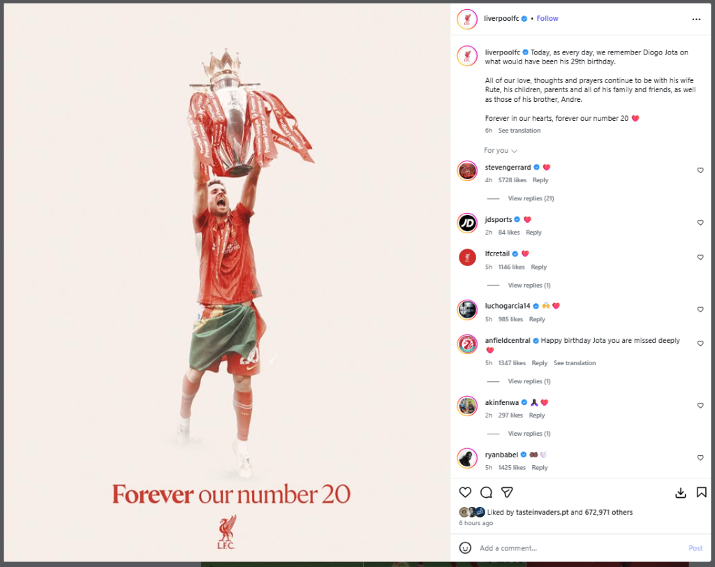“Hoje, como todos os dias, recordamos Diogo Jota naquele que seria o seu 29.º aniversário. Todo o nosso amor, pensamentos e orações continuam a estar com a sua esposa Rute, os seus filhos, pais e toda a sua família e amigos, bem como com os do seu irmão, André. Eternamente nos nossos corações, eternamente o nosso número 20“.