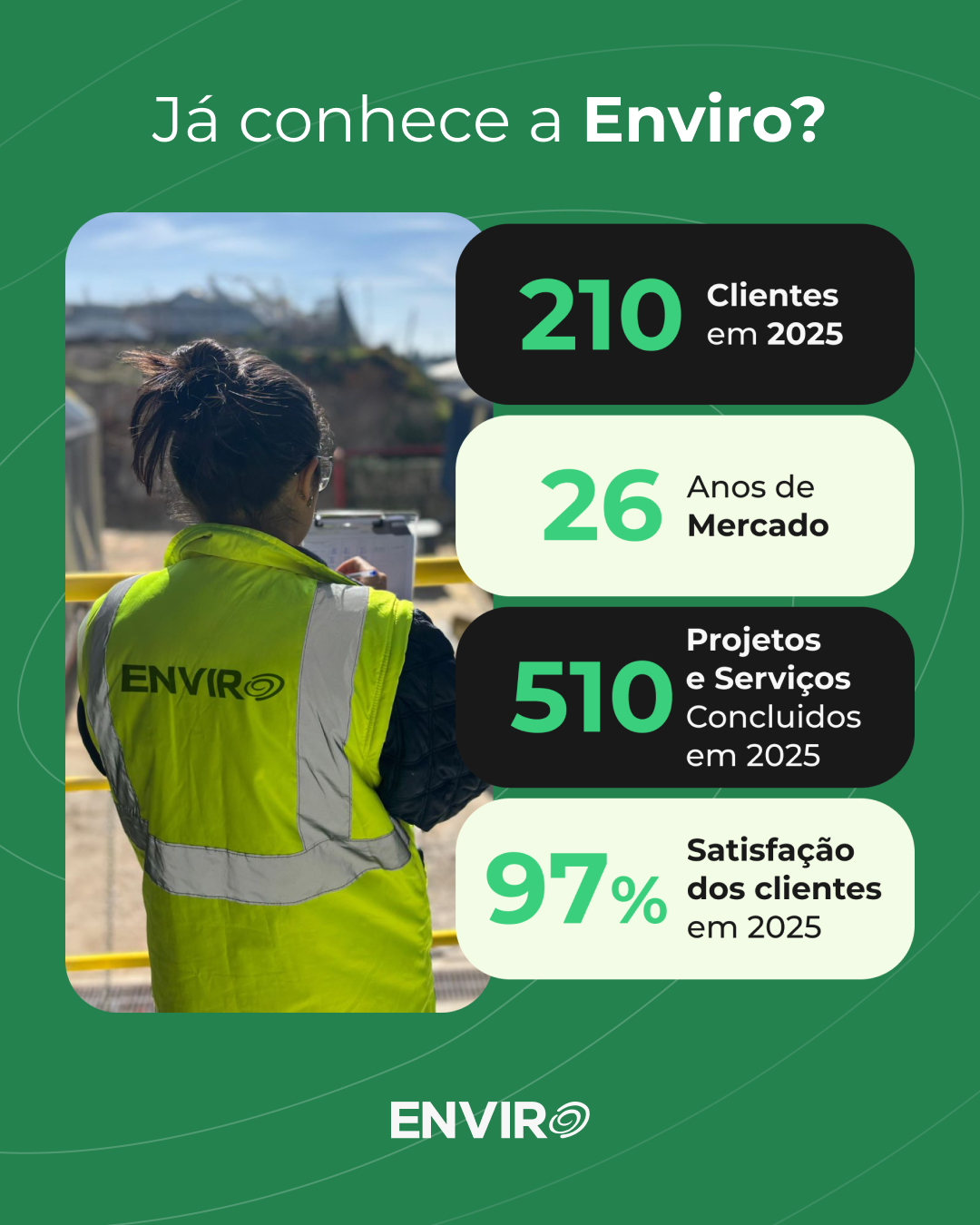 A ENVIRO é uma empresa de prestação de serviços nas áreas do ambiente e segurança no trabalho com mais de 25 anos de experiência no mercado nacional! A ENVIRO é certificada pela Qualidade, Ambiente e Segurança e possui um laboratório acreditado. Em 2025 realizámos mais de 500 projetos com um nível de satisfação de 97%! Peça já a sua proposta em https://enviro.pt/