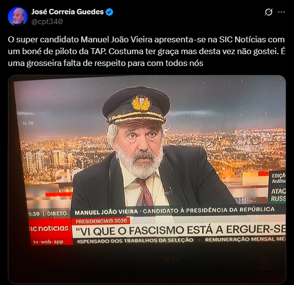 “O supercandidato Manuel João Vieira apresenta-se na SIC Notícias com um boné de piloto da TAP. Costuma ter graça, mas desta vez não gostei. É uma grosseira falta de respeito para com todos nós”, escreveu.