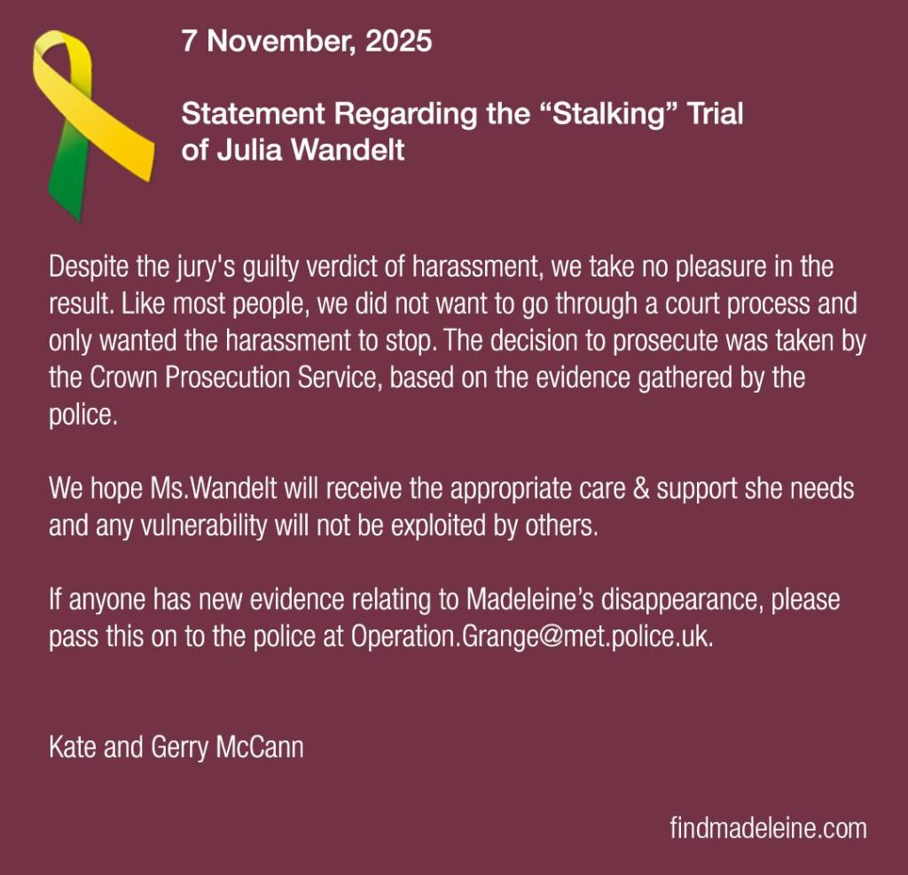 O caso foi parar à justiça e depois de um julgamento que durou cinco semanas, a arguida foi agora condenada por assédio numa sentença que pode chegar a um máximo de seis meses de prisão. Apesar da condenação, Julia Wandelt foi absolvida pelo júri da acusação de perseguição, já que na legislação da Grã-Bretanha este crime está associado ao ato de seguir alguém ou de se dirigir à sua casa de forma não solicitada e obsessiva. Karen Spragg, uma mulher, de 60 anos, natural de Cardiff, que também era arguida no processo, vista como ajudante Waldent e acusada por “perseguição com grave alarme ou angústia”, foi absolvida.