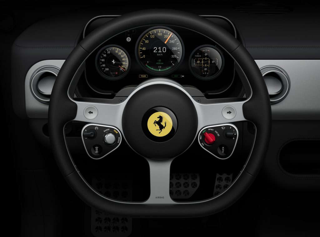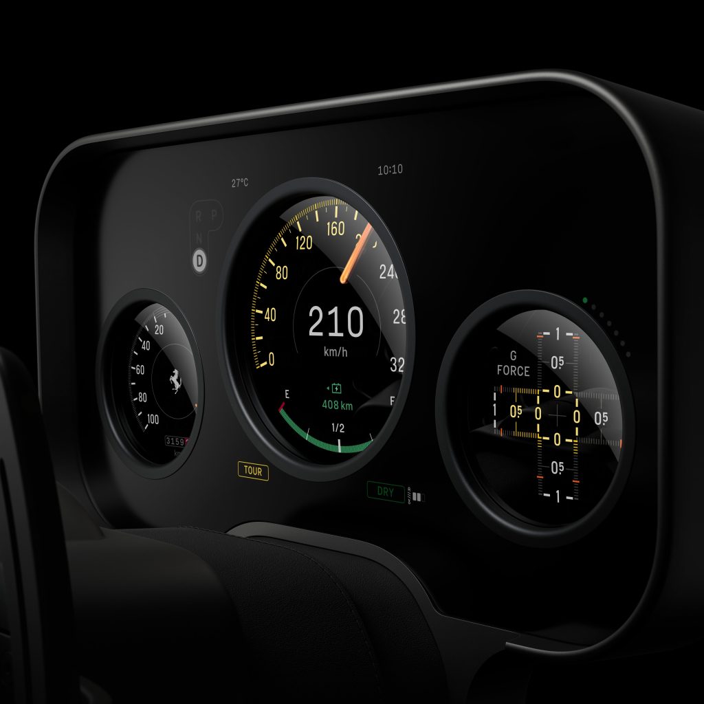 A instrumentação combina elementos digitais com ponteiros físicos integrados num ecrã OLED de camadas sobrepostas, evocando a estética analógica dos modelos clássicos da marca. O volante, de três braços esguio e minimalista, reforça a ligação ao passado desportivo da Ferrari, ao mesmo tempo que incorpora funcionalidades modernas.