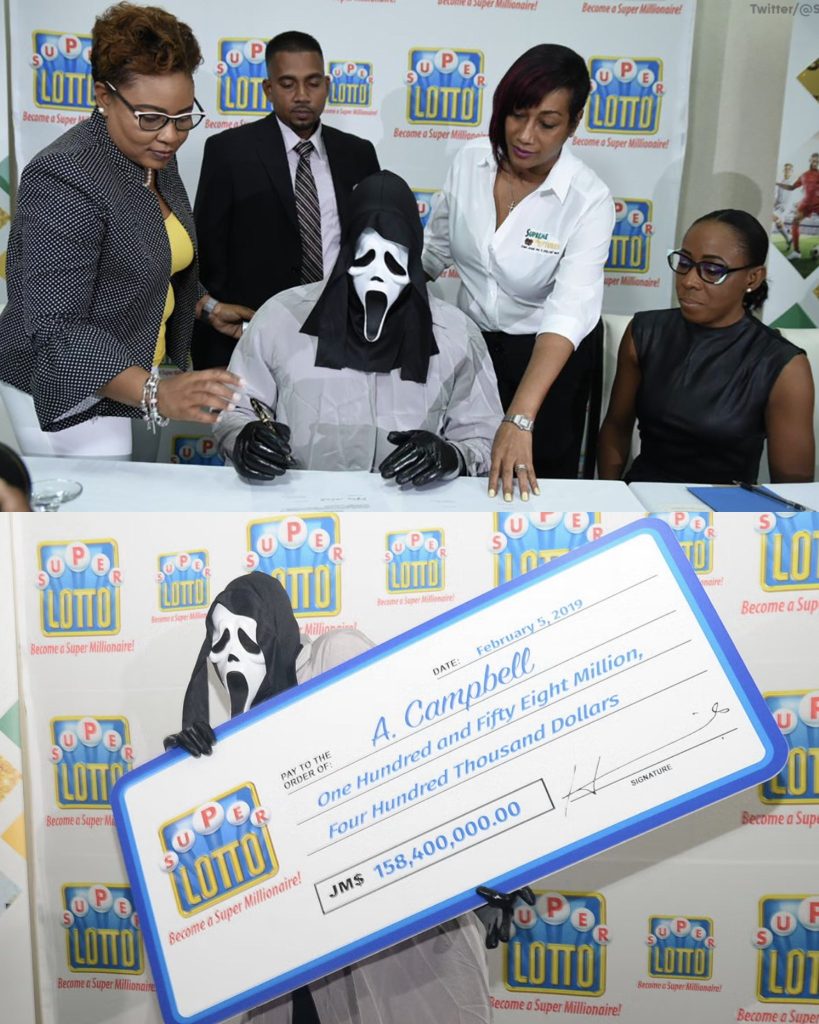 O vencedor, que arrecadou cerca de 1,17 milhões de dólares (aproximadamente 1,01 milhões de euros) no Super Lotto, apresentou-se usando a conhecida máscara de Ghostface, personagem do filme ‘Scream’. Preferiu identificar-se apenas como A. Campbell, evitando qualquer exposição pública.