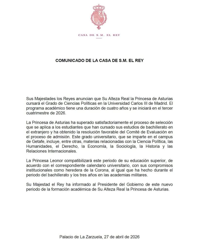 A Casa Real espanhola anunciou esta segunda-feira, dia 27, uma nova etapa na vida da princesa Leonor: após concluir três anos de formação militar, a herdeira ao trono vai iniciar, depois do verão, a licenciatura em Ciência Política na Universidade Carlos III, em Madrid. Segundo o comunicado divulgado pela Casa Real, a princesa foi admitida após concluir com sucesso o processo de seleção destinado a estudantes com formação secundária no estrangeiro.