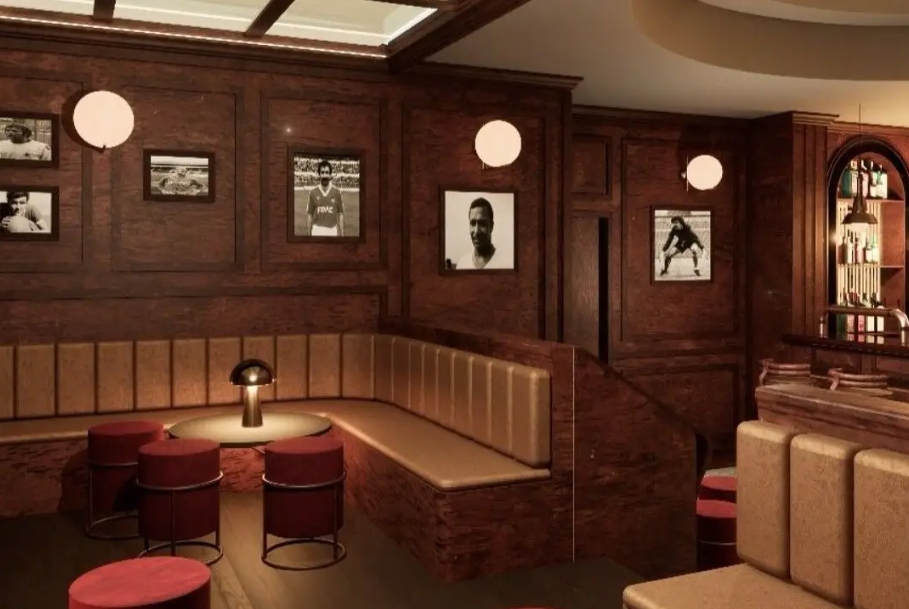 O hotel também terá um bar inspirado nos clássicos pubs ingleses: “O desafio era criar um ambiente que respirasse tradição e que honrasse a história do Clube. Projetámos um bar íntimo e icónico, decorado com fotografias de momentos marcantes e um teto onde o emblema do Benfica toma o protagonismo. Um espaço pensado para conectar emoção e design.”