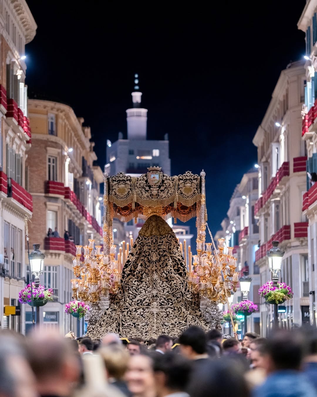 Contudo, é em Málaga que a escala das celebrações assume proporções singulares através dos seus “Tronos”. Estas estruturas monumentais de madeira e prata distinguem-se dos tradicionais “pasos” pelo seu peso e dimensão. Um dos exemplos mais emblemáticos é o trono da Virgem del Rocío, conhecida como a “Noiva de Málaga”, que supera os 4.000 quilos. Para mover esta estrutura, é necessária a força coordenada de 250 homens de trono, que carregam o peso diretamente sobre os ombros.