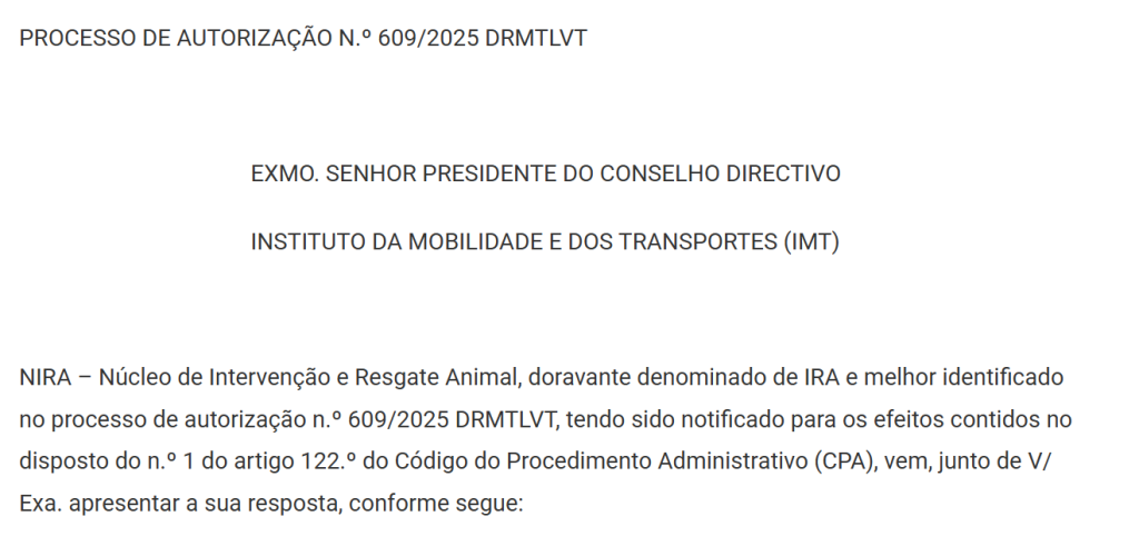 O Núcleo de Intervenção e Resgate Animal (IRA) entregou ao Instituto da Mobilidade e dos Transportes (IMT) a sua contestação ao projeto de revogação da autorização que permitia à associação circular com avisadores luminosos e sonoros de emergência. A resposta foi apresentada quase um mês depois de o IMT ter anunciado a intenção de retirar essa autorização.