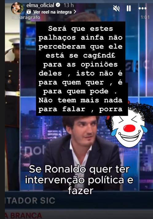 Perante os comentários negativos, as irmãs vieram em defesa do capitão da Seleção Nacional. Elma Aveiro, de 52 anos, foi a primeira a reagir: “Será que estes palhaços ainda não perceberam que ele está -se cag***do para as opiniões deles? Isto não é para quem quer, é para quem pode. Não têm mais nada para falar, porra.” Este foi o comentário colocado num story onde se pode observar uma foto de João Maria Jonet enquanto fazia o seu comentário ao assunto na SIC.