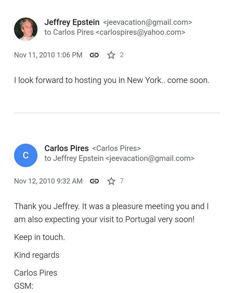Não se sabe se Carlos Pires chegou a aceitar o convite. O 24Horas, apesar de todos os esforços, não conseguiu contactar o nosso embaixador em Singapura. O então adjunto de Luís Amado derreteu-se com as atenções de Epstein. Respondeu-lhe horas depois, manhã cedo: “Obrigado, Jeffrey. Foi um prazer conhecê-lo e aguardo também a sua visita a Portugal muito em breve. Mantemos o contacto”.
