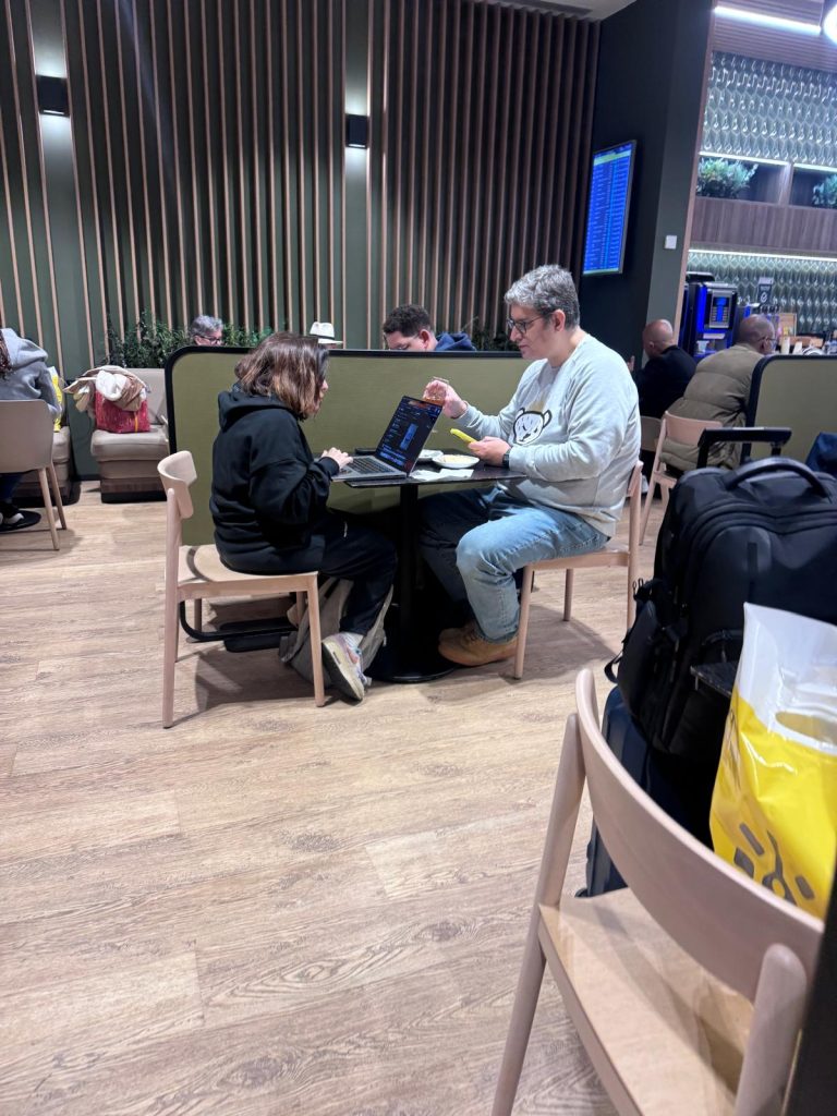 Aparentemente descontraída, a humorista foi captada pelo 24Horas ao computador, podendo estar a finalizar alguns pormenores de trabalho, na rádio ou na televisão, antes de embarcar. Por sua vez, o marido aproveitou para tomar uma refeição.