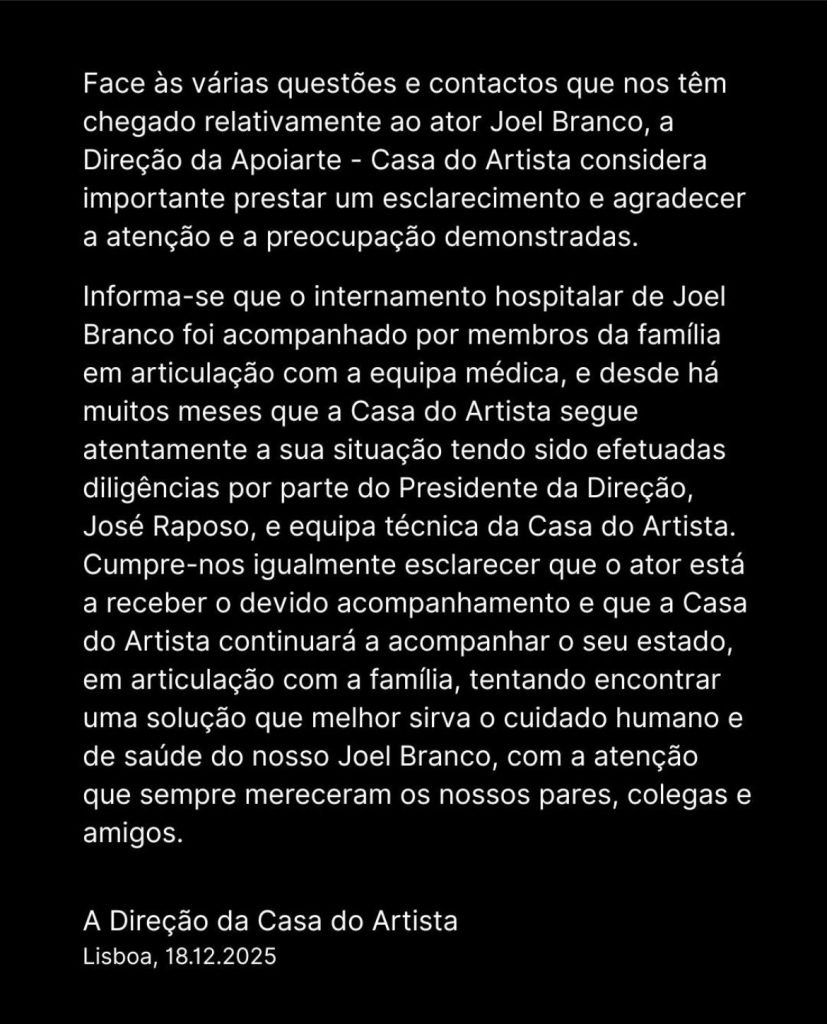 No comunicado que foi publicado nas redes sociais nesta quinta-feira, dia 18 de dezembro, a instituição garante que o ator tem sido acompanhado de forma regular, tanto pela Casa do Artista como por familiares, em articulação com a equipa médica responsável.