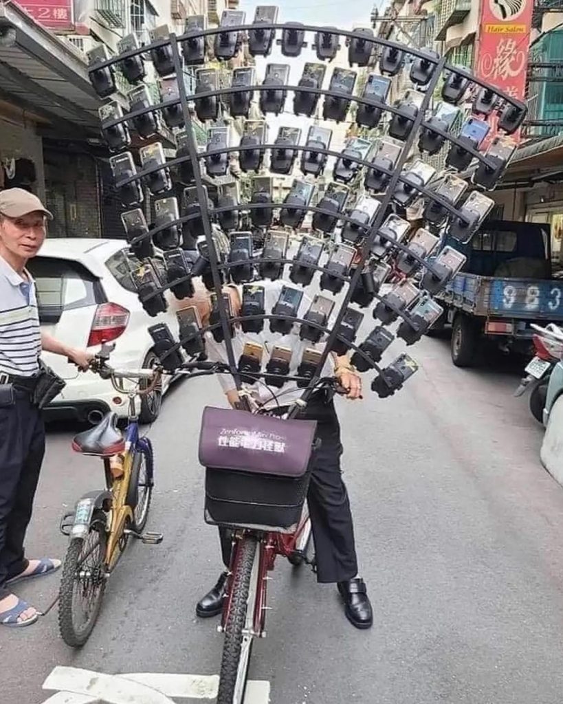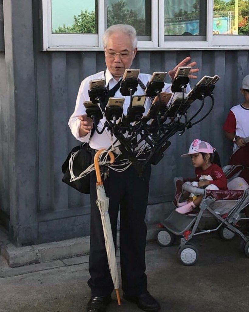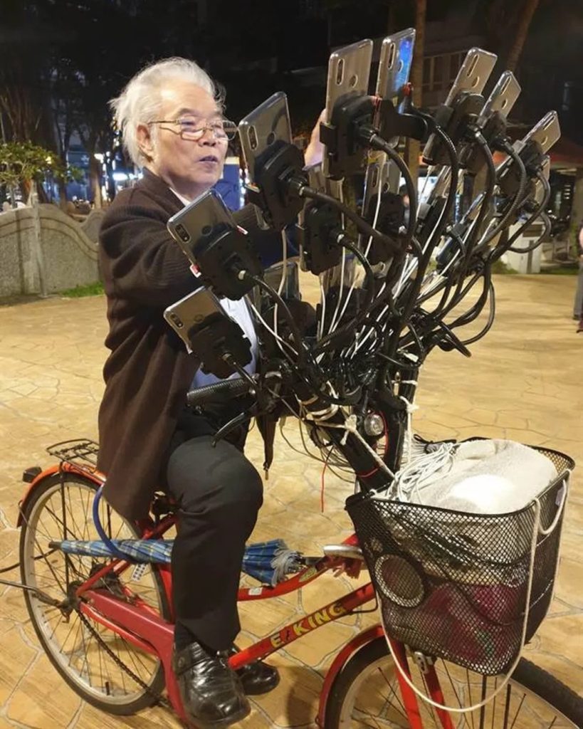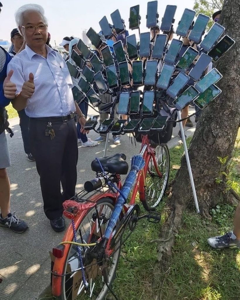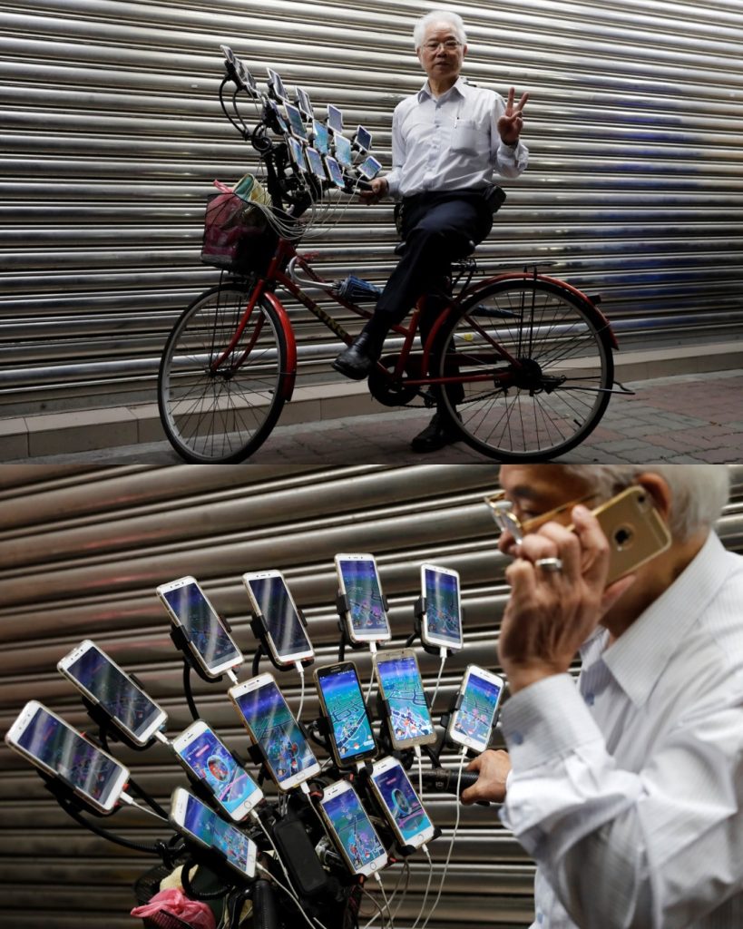 Há alguns meses, a sua bicicleta já estava equipada para transportar cerca de 30 telemóveis ligados ao mesmo tempo. Contudo, o número continuou a crescer e o ‘avô do Pokémon’ já foi visto com mais de quatro dezenas de dispositivos instalados no veículo. Num evento de jogadores realizado em Taipei, o taiwanês voltou a ser o centro das atenções ao surgir com o impressionante equipamento.