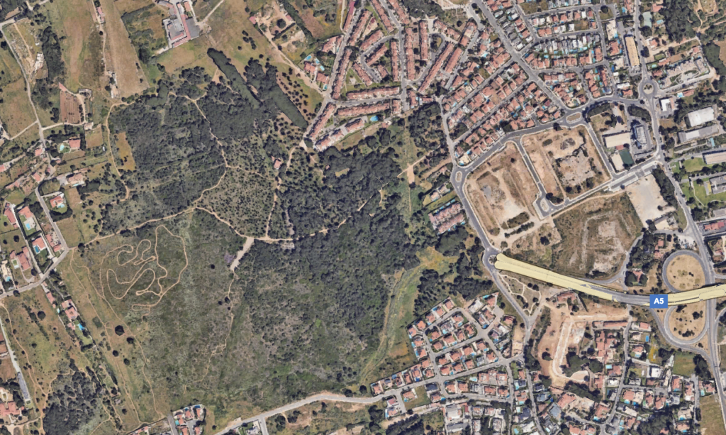 O parque urbano vai ser construído, mesmo no final da autoestrada A5, num terreno de 450 mil metros quadrados que sempre esteve sujeito a forte pressão urbanística. O terreno foi propriedade da fundação Aga Khan, que, entretanto, o vendeu a um fundo imobiliário fechado – o Lusofundo – gerido pela sociedade anónima Statusdesafio Capital. Localizado numa numa zona estratégica do concelho, mesmo à medida de gigantescos interesses de construção, o que hoje é um autêntico ‘pulmão’ ambiental daria lugar mais dia menos dia a uma impenetrável selva de betão.
