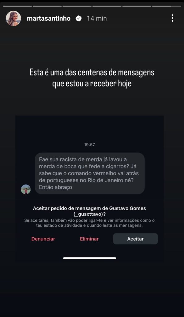 Numa história, publicada no Instagram, é possível ler ameaças de morte que lhe foram enviadas: “Eae sua racista de mer**”; “Já lavou a merda de boca que fede a cigarros?”; e “já sabe que o Comando Vermelho (CV) vai atrás de portugueses no Rio de Janeiro, né? Então abraço.”