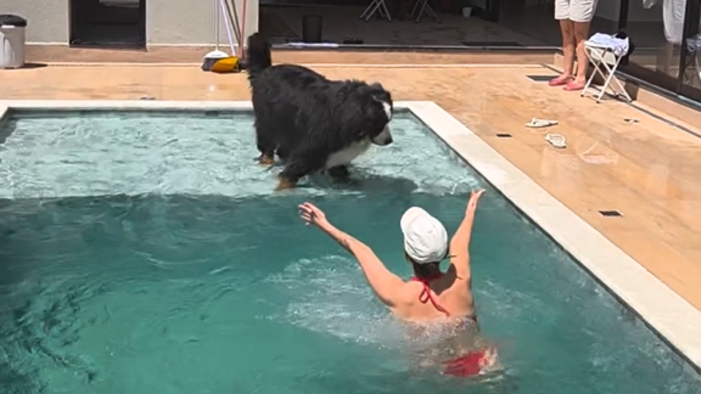 No vídeo, é possível ver um Boiadeiro Bernês à beira da piscina, a observar atentamente a sua dona enquanto esta salta para a água e começa a nadar. Apesar dos vários incentivos, ele mostra-se hesitante e prefere ficar longe da água.