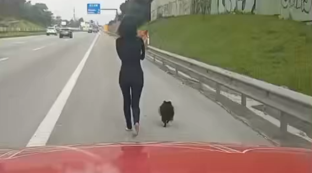 Um novo vídeo mostra o momento em que uma mulher passeou dois cães em plena autoestrada A2. Nas imagens, vê-se ela a caminhar, descalça, na berma da estrada, com um cão ao colo e um outro ao seu lado.
