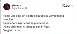 Numa publicação na rede social X, o extremo das águias insurgiu-se contra a decisão do organismo que tutela as competições europeias. “Dar um murro sem bola pode-se, vê-se e sanção nenhuma. Castigar sem provas pode-se, vê-se. Já nem tentam esconder com o Real. Dão vergonha”, podia ler-se no escrito, entretanto apagado.