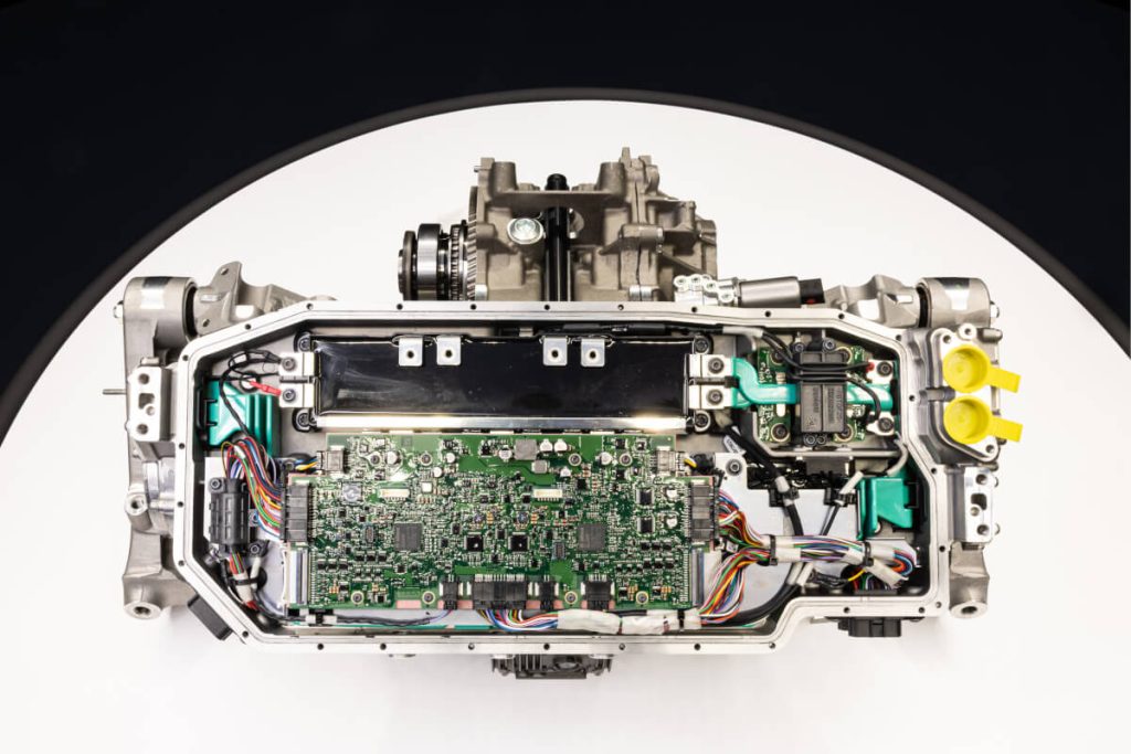 O inversor dianteiro está integrado, diretamente, no eixo, o que reduz espaço e peso, controlando, simultaneamente, os dois motores dianteiros, gerando até 300 kW de potência com apenas 9 kg.