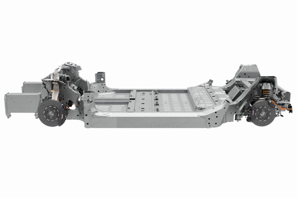 Na zona central, o chassis integra completamente a bateria, localizada no piso. O design dá prioridade à redução do peso total do sistema bateria/chassis e a colocação do pack de baterias no ponto mais baixo possível.