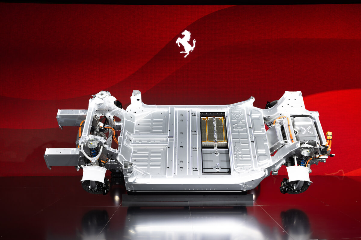 Nesta fase, foram revelados os principais componentes do novo modelo, bem como seu chassis, que assinala um marco na estratégia de neutralidade tecnológica da Ferrari, que já integra motores endotérmicos, híbridos HEV e PHEV e, agora, também propulsão totalmente elétrica.