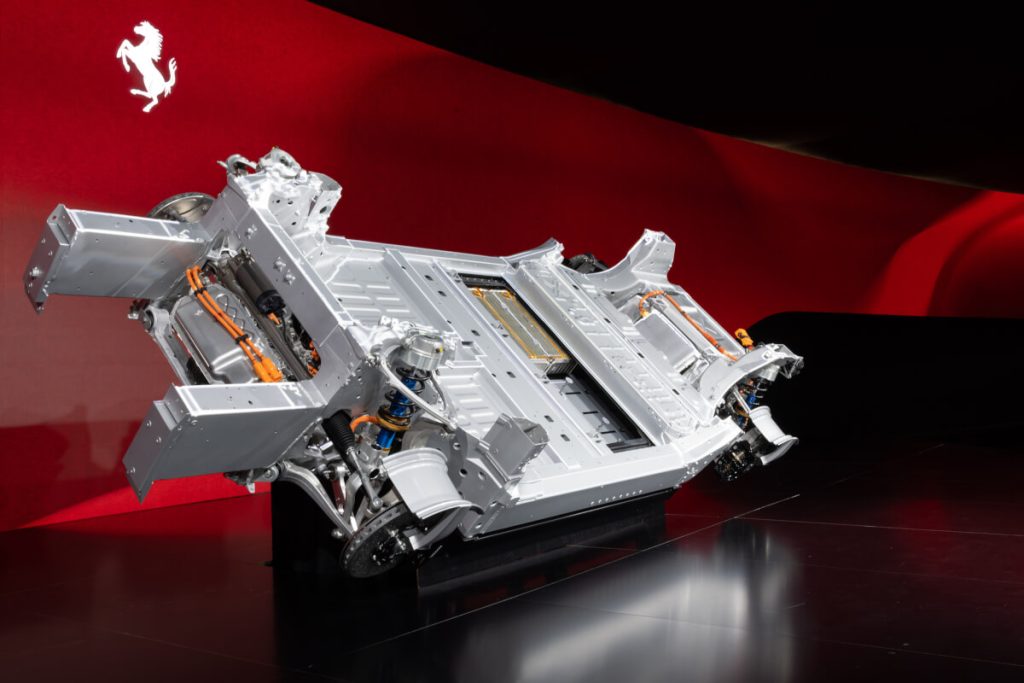 A solução foi o desenvolvimento do primeiro subchassis mecânico elástico na história da casa de Maranello. Na ausência das vibrações próprias de um motor de combustão interna, os ruídos restantes tornam-se mais percetíveis, o que poderia afetar a experiência a bordo.
