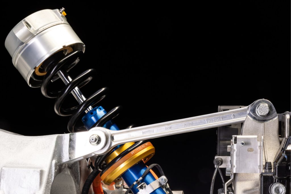 O motor elétrico mantém o mesmo binário das aplicações anteriores e regula, ativamente, as forças entre o chassis, os pneus e o terreno, sem comprometer o ajuste elástico variável nem o controlo dos movimentos da carroçaria.