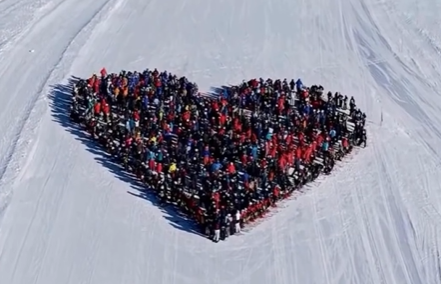 No vídeo é possível ver centenas de pessoas a esquiar pela neve e, no final, todas elas a juntarem-se para formar um coração humano.