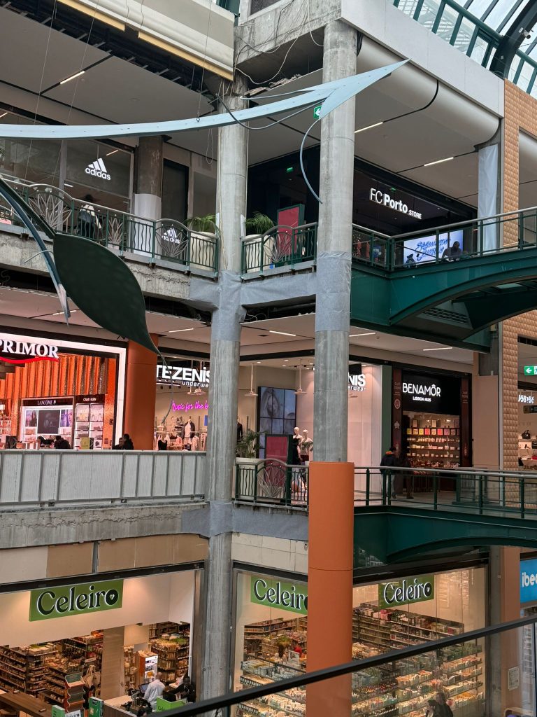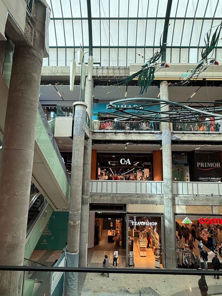 Esta segunda-feira, dia 17, todos os pilares desde a entrada principal do shopping até à loja da Primor se encontram tapados.